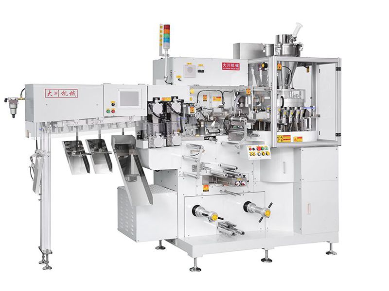 - Esta envasadora rotativa proporciona duraciones de llenado extendidas para evitar la sujeción de materiales en el área de sellado límite y garantiza sustancialmente la estabilidad de la línea de producción.