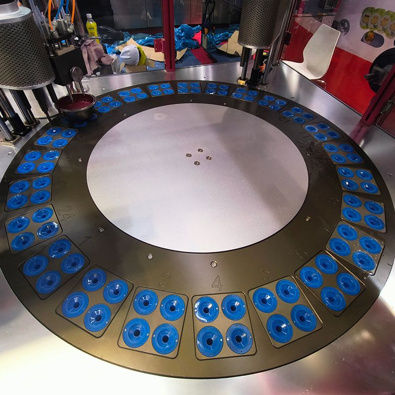 La llenadora de lápiz labial está equipada con una plataforma giratoria que cumple funciones de llenado y enfriamiento. Este diseño eficiente gira a un ritmo establecido para garantizar una temperatura constante en todos los moldes de gel de sílice, lo que permite la producción de lápices labiales de la misma calidad. Además, el sistema de suministro y descarga de contenedores de plataforma giratoria que lo acompaña permite una fácil operación para un empleado.